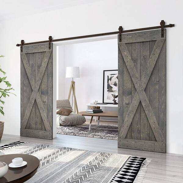 X 92 in. x 84 in. Weather Gray Stained DIY Solid Pine Wood Interior Double Sliding Barn Door with Hardware Kit