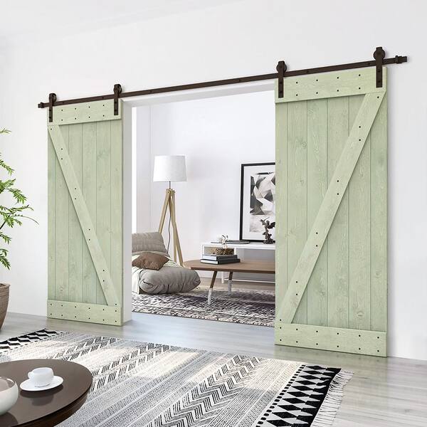 Z 68 in. x 84 in. Bar Series Sage Green Stained DIY Solid Pine Wood Interior Double Sliding Barn Door with Hardware Kit