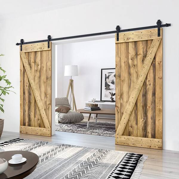 Z Bar 76 in. x 84 in. Pre-Assembled Weather Oak Stained Wood Interior Double Sliding Barn Door with Hardware Kit