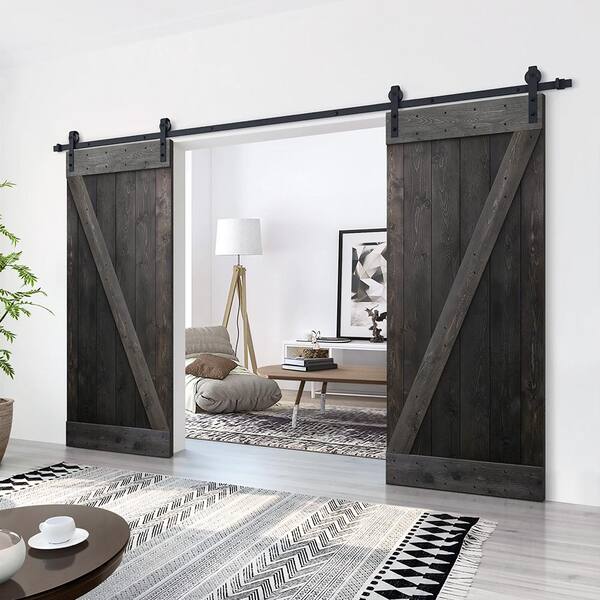 Z Bar 84 in. x 84 in. Pre-Assembled Weather Gray Stained Wood Interior Double Sliding Barn Door with Hardware Kit