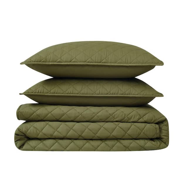 Solid Oversized Percale Cotton Olive Green Full/Queen 3 Piece Quilt Set