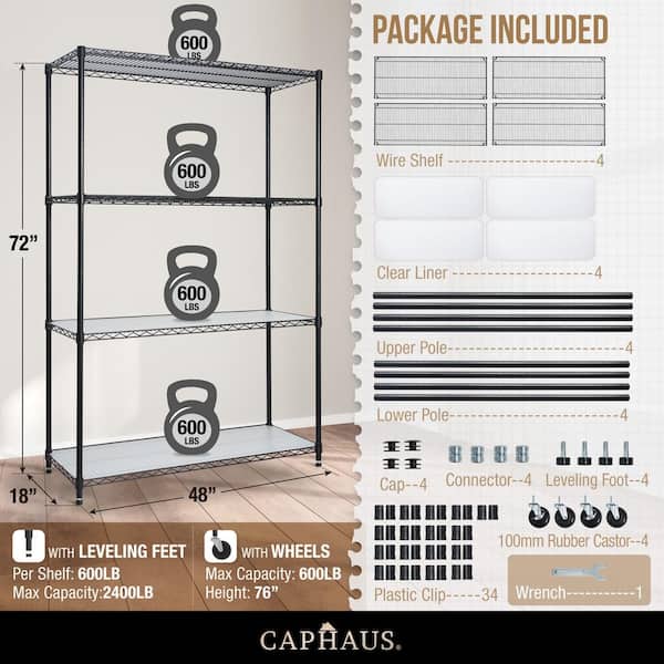 Black 4-Tier Adjustable Welded Steel Heavy Duty Garage Storage Unit Shelving with Liner (48 in. W x 72 in. H x 18 in. D)