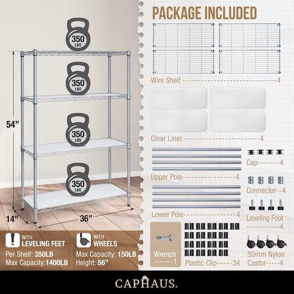 Silver 4-Tier Welded Steel Garage Storage Shelving Unit with Liner and Wheels (36 in. W x 56 in. H x 14 in. D)