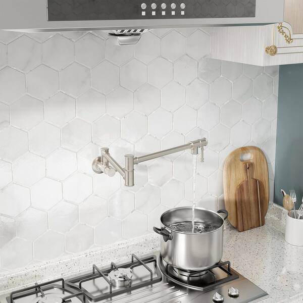 1.8 GPM Wall Mounted Foldable Kitchen Pot Filler with Double Handle in Brushed Nickel