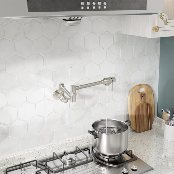 1.8 GPM Wall Mounted Mount Pot Filler Kitchen Faucet with Folding Stretchable Double Joint Swing Arms in Brushed Nickel