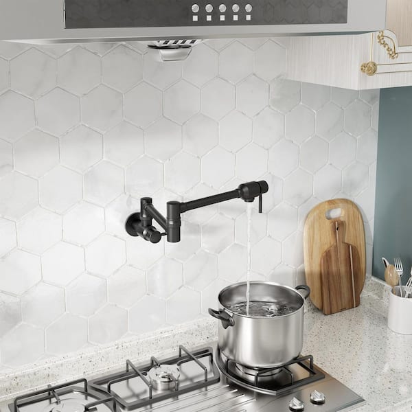 1.8 GPM Wall Mounted Mount Pot Filler Kitchen Faucet with Folding Stretchable Double Joint Swing Arms in Matte Black
