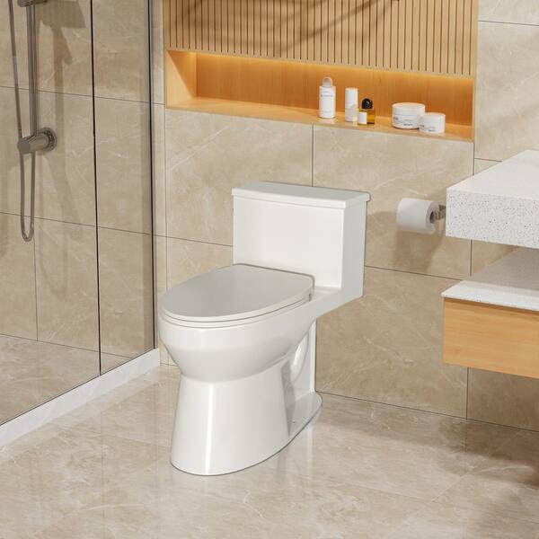 1-Piece 1.28 GPF Single Flushing Elongated Toilet in White with Soft Closing Seat