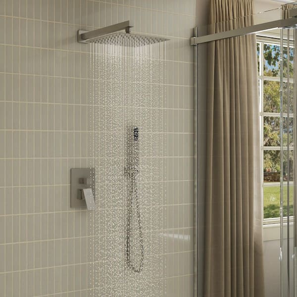 2-Spray 10 in. Square Wall Mount Dual Shower Heads with Hand Shower Faucet 2.5 GPM in Brushed Nickel (Valve Included)