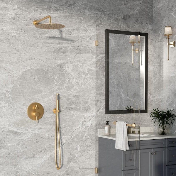 2-Spray Patterns Round 2-Function 10 in. Wall Mount Dual Shower Heads with Handheld 2.5 GPM in Brushed Gold