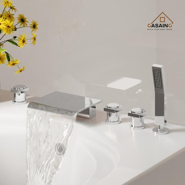 3-Handle Deck Mount Roman Tub Faucet with Stainless Steel Hand Shower in Chrome Plated