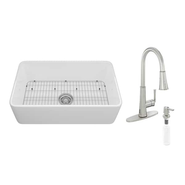 30 in. Farmhouse Apron Single Bowl White Fireclay Kitchen Sink with Faucet and Accessories All-in-one Kit