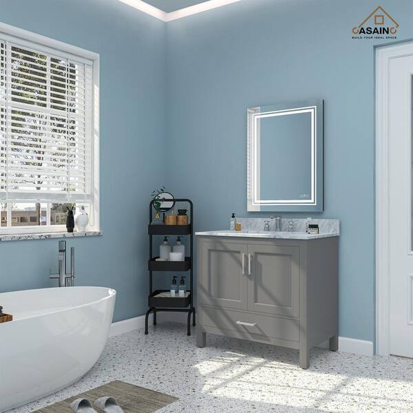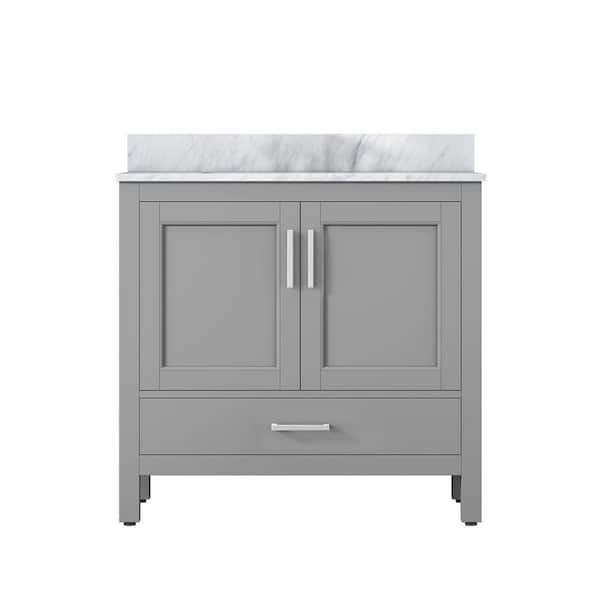 35.2 in. W x 21.65 in. D x 38.58 in. H Single Sink Freestanding Bath Vanity in Grey with White Carrara Marble Top