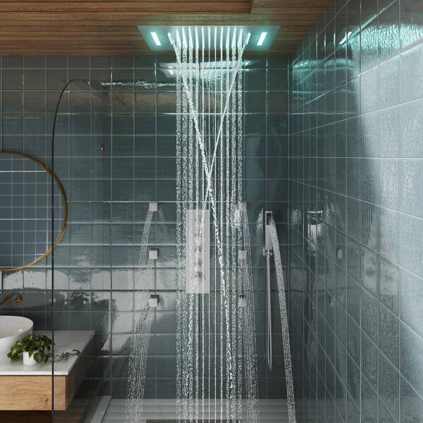4-Spray Dual Shower Head and Handheld Shower Head Ceiling Mount 2.5 GPM with 6-Body Jets, LED and Music, Brushed Nickel