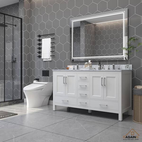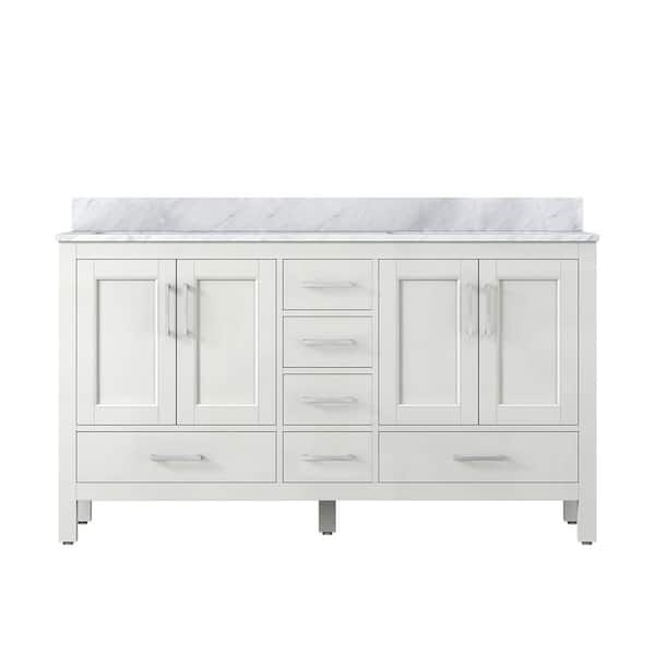 59.29 in. W x 21.65 in. D x 38.58 in. H Double Sink Bath Vanity in White with White Carrara Marble Top