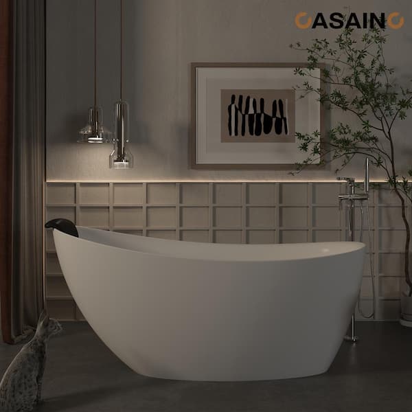 59 in. x 30 in. Solid Surface Stone Free Standing Tub Soaking Bathtub in Matte White with Black Bathtub Pillow