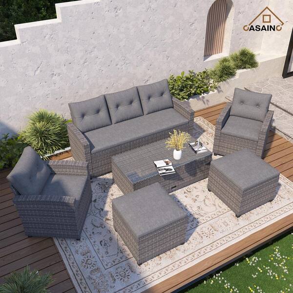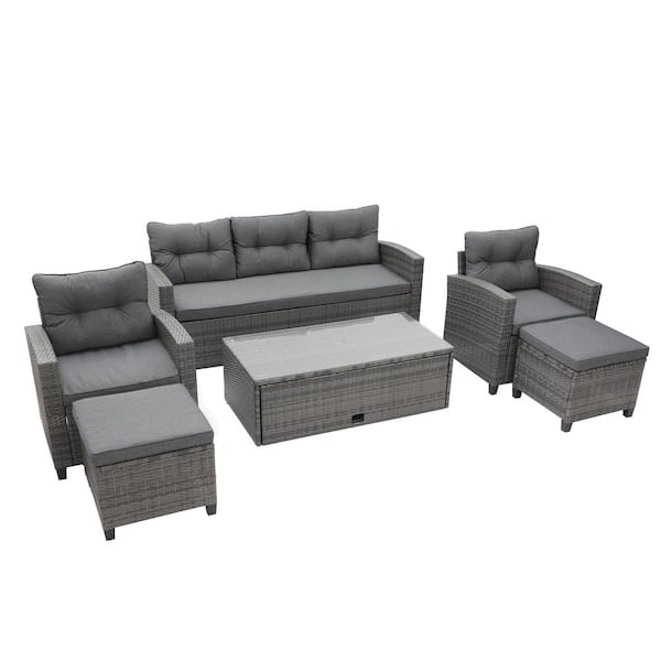 6-Piece Wicker PE Rattan Patio Conversation Sectional Set Garden Seating Furniture, Light Gray Cushions