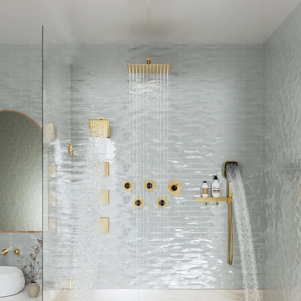 6-Spray 12 in. Wall Mount Dual Shower Heads and Handheld Shower Head with 2.5 GPM and Body Jets in Brushed Gold