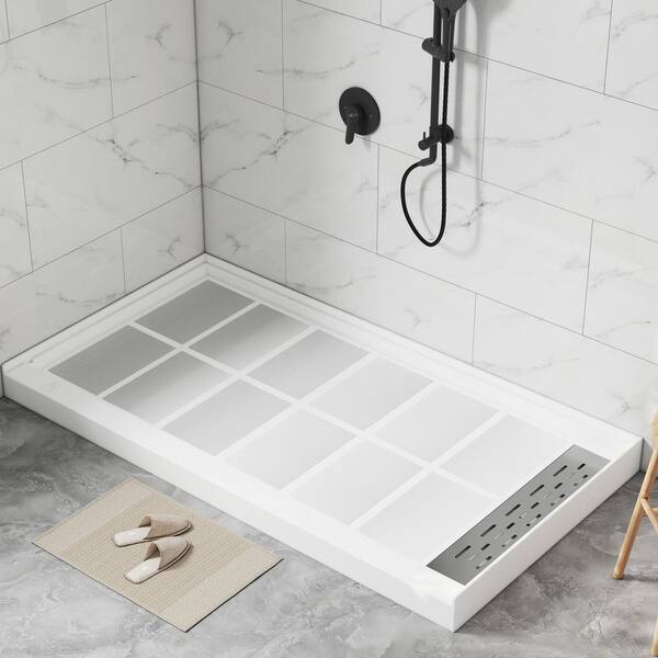 60 in. x 32 in. Composite Alcove Shower Pan Base with Stainless Steel Cover and Right Drain in White