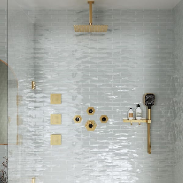 7-Spray 12 in. Wall Mount Dual Shower Heads and Handheld Shower Head with 2.5 GPM 3-Jet in Brushed Gold (Valve Included)