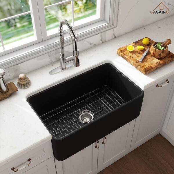 All-in-One 30 in. Farmhouse/Apron-Front Single Bowl Fireclay Kitchen Sink with Kitchen Faucet, Grid and Basket Strainer