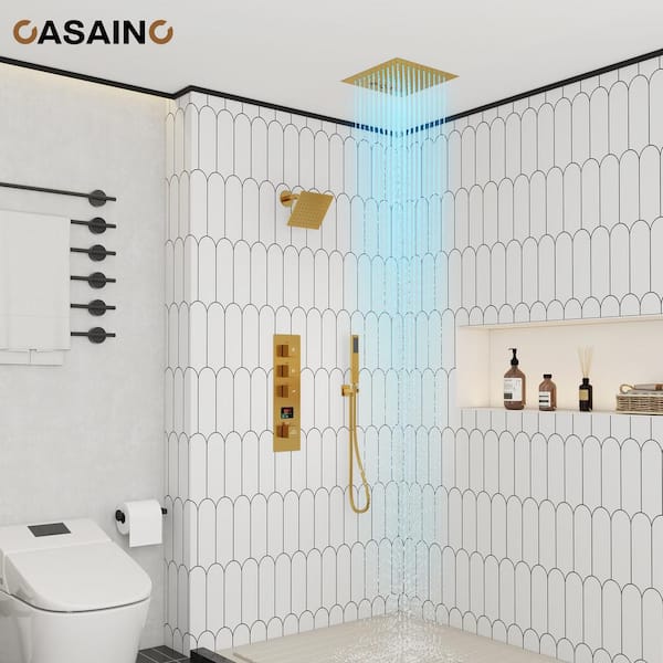 Digital Display 3 Function Single Handle 1-Spray Thermostatic Dual Shower Faucet 1.8GPM with LED & Music in Brushed Gold