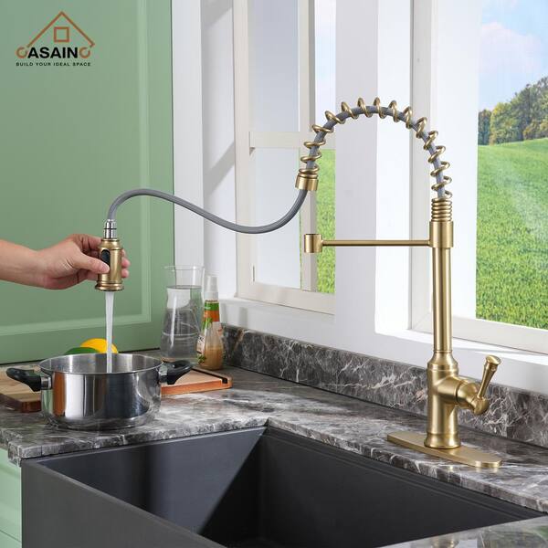 Single Handle 21-Inch Pull Down Sprayer Kitchen Faucet with Dual Function Sprayhead, Deckplate Included in Brushed Gold