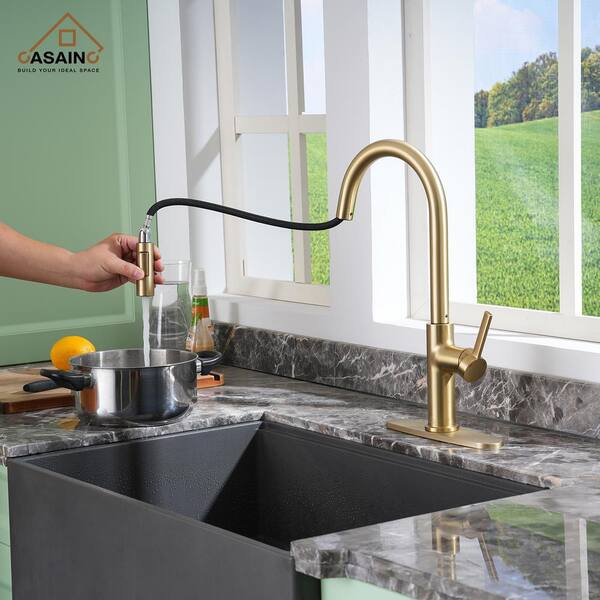 Single Handle Pull-Down Sprayer Kitchen Faucet with Dual-Function Pull out Sprayer head, Stainless Steel in Brushed Gold