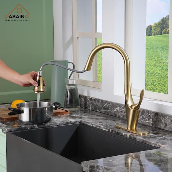 Single Handle Pull Down Sprayer Kitchen Faucet with Dual-Function Pull out Sprayer head, Stainless Steel in Brushed Gold