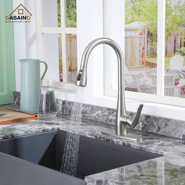Single Handle Pull Down Sprayer Kitchen Faucet with Three-function Pull Out Sprayer in Brushed Nickel