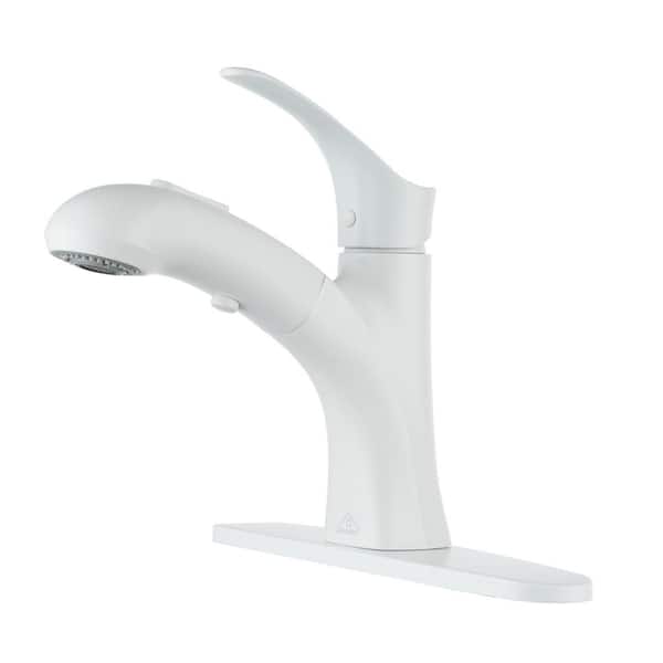 Single Handle Single Hole Bathroom Faucet with Pull-Out Sprayer head, Deckplate Included in Stainless steel Matte White
