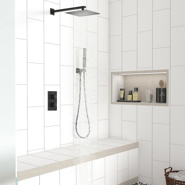 Thermostatic 1-Spray Square 10 in. Rain Dual Shower Head Wall Mount Fixed and Handheld Shower Head 1.5 GPM, Matte Black
