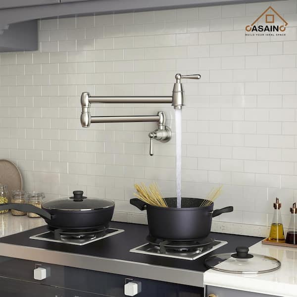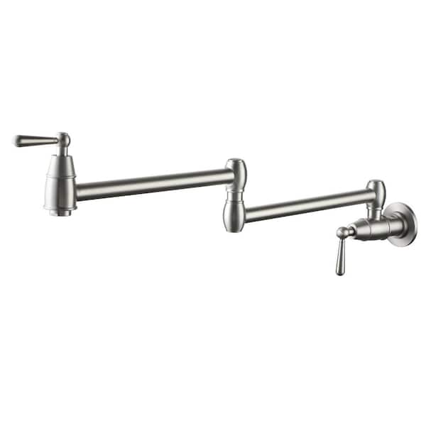 Wall-Mounted Kitchen Faucet Folding Pot Filler with Double Handles in Brushed Nickel
