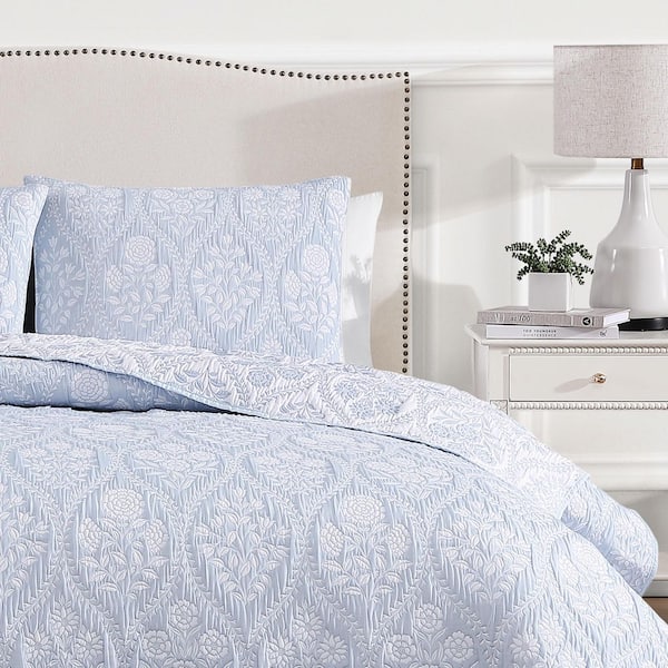 Laurel Woodblock Cornflower Blue 3-Piece Soft Woven Matelasse Jacquard Reversible Cotton Blend Quilt Set-King