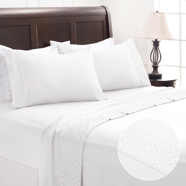 3-Piece Clipped White Solid Color Tufted Textured Boho Microfiber Bedsheets Set Twin