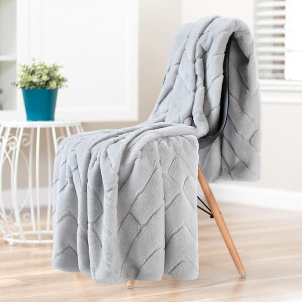 Geometric Silver Faux Fur Polyester Throw Blanket with Reversible Mink, 50 x 65 in.