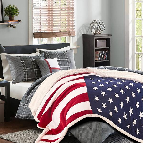 Patriotic US Flag Print Red Reversible Sherpa Polyester Throw Bed Blanket - King
