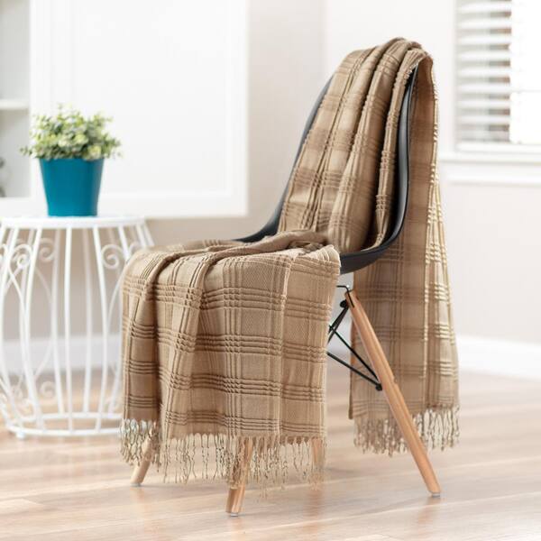 Pleated Solid Beige Acrylic Throw Blanket with Tassels - 50 in. x 65 in.