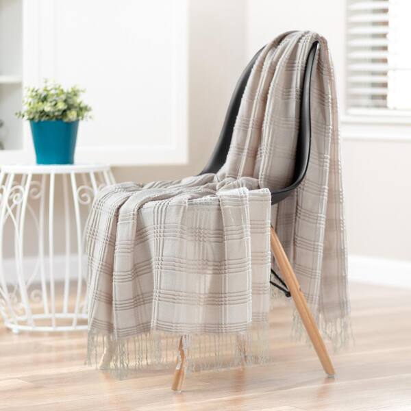 Pleated Solid Light Taupe Acrylic Throw Blanket with Tassels - 50 in. x 65 in.