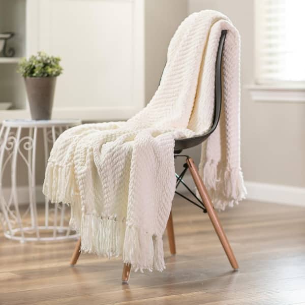 Textured Knit Creme Acrylic Polyester Throw Blanket with Tassels - 60 in. x 70 in.