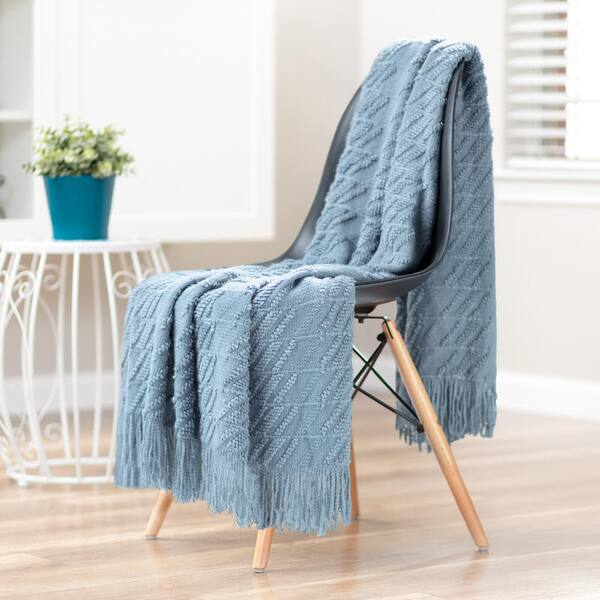 Textured Light Blue Bevel Knit Acrylic Throw Blanket with Tassels, 50 x 65 in.