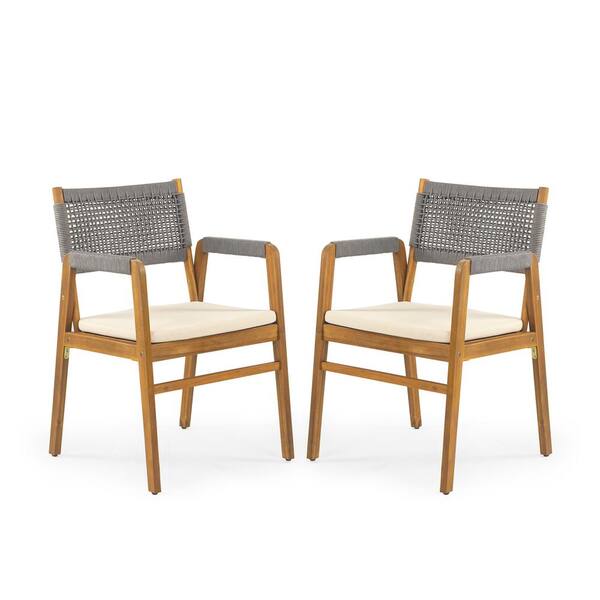 Agnes 7-Piece Wood and Rope Woven Rectangle Patio Outdoor Dining Set with Beige Cushion Expandable Table Teak plus Grey