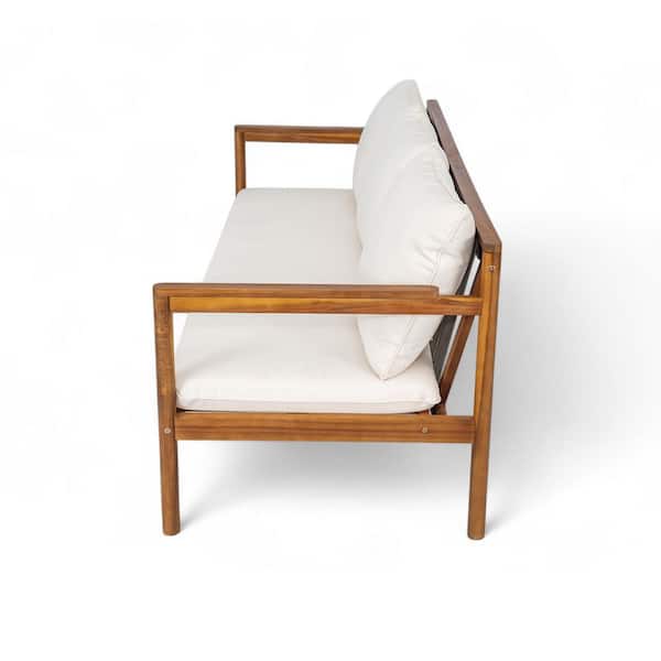 Alexis Teak Finish Acacia Wood Patio 3 Seater Sofa Outdoor Couch with Cream Cushions and Rope Weave Backrest