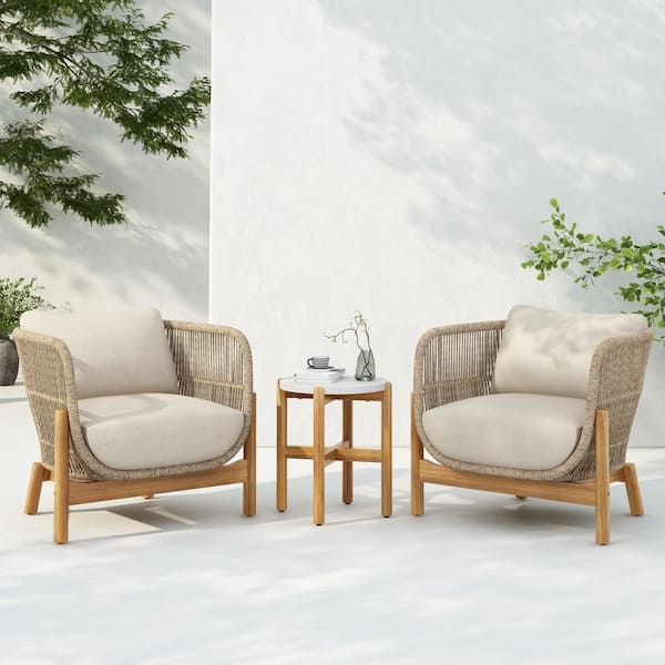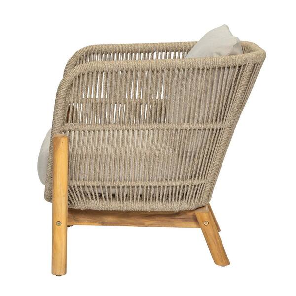 Aurora 3-Piece Solid Wood and Rope Woven Outdoor Patio Conversation Set with Beige Cushions, End Table, Teak