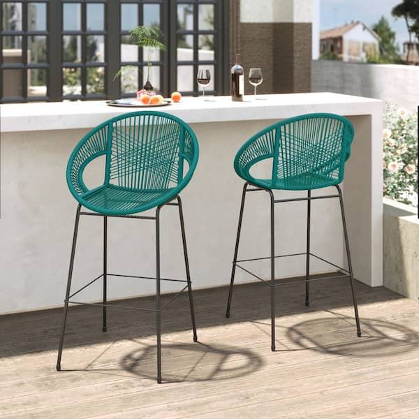Dakota 28.5 in. Patio PE Rattan and Metal Outdoor Bar Stools, Teal, Set of 2