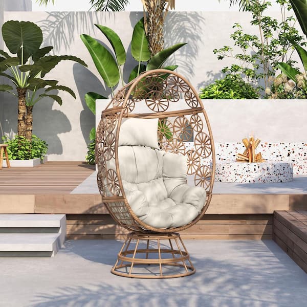 Grove Outdoor Metal Patio Swivel Egg Basket Lounge Chair, Iron, PE Rattan, Beige Cushions, Beige Plus Brown