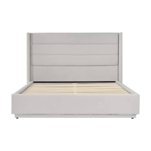 Hawthorne Gray Linen Upholstered Wood Frame Queen Size Platform Bed with Headboard, LED Lighting, Greige