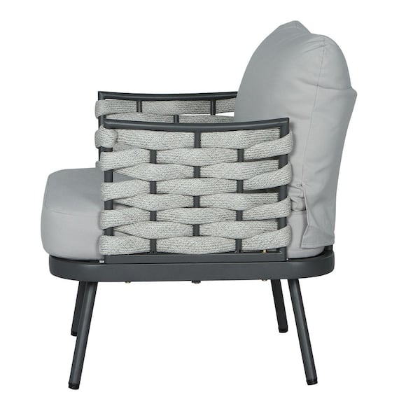 Kaiden Modern Grey Metal and Rope Weave Patio Outdoor Lounge Chair with Light Gray Cushions, Set of 2