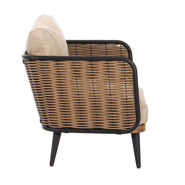 Logan Teak Brown Faux Rattan Outdoor Patio Lounge Chair with Beige Cushions, Black Metal Legs, Set of 2