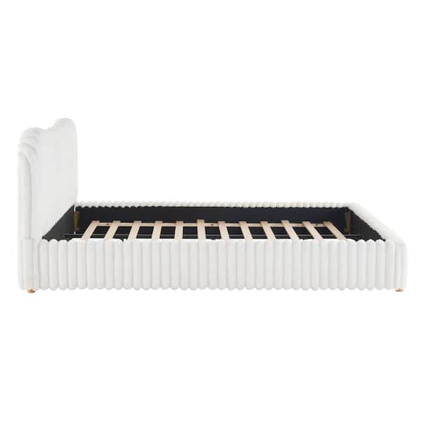 Orion White Boucle Fabric Upholstered Solid Wood Frame King Size Platform Bed with Wavy Headboard, Vertical Stitching