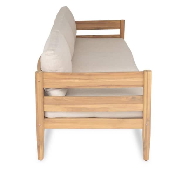 Parker Light Teak Finish Acacia Wood Patio Outdoor 3 Seater Couch with Beige Cushions, Slatted Frame, Curved Back
